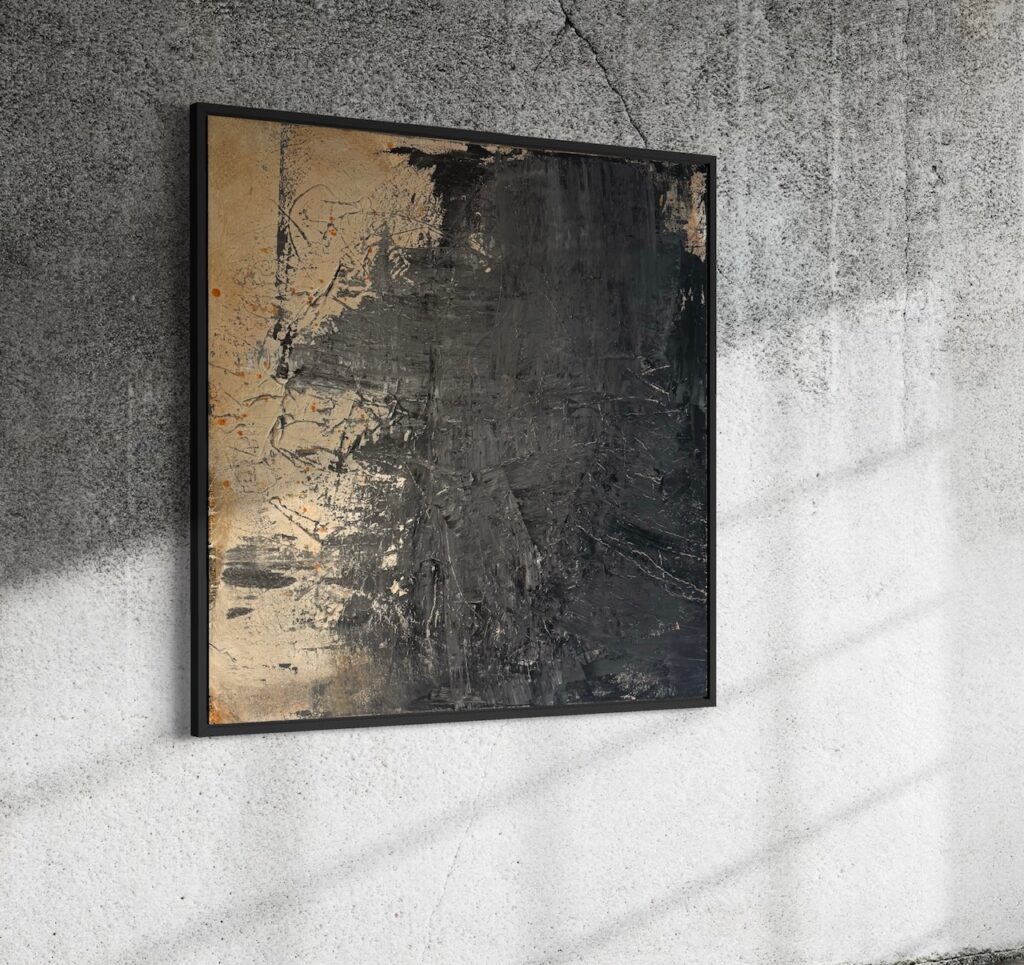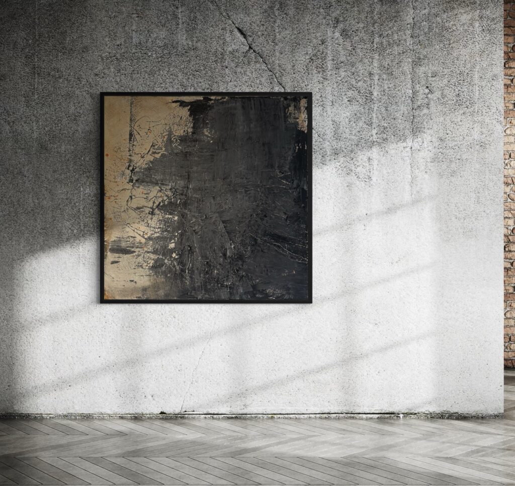 Cinder forms itself through deep blacks, smoked charcoal, and subtle bronzed undertones revealed by scraping. A misted rain layer softens the darker passages and allows faint glimmers of light to move across the surface. The palette feels volcanic and ancient, steady and quietly powerful.